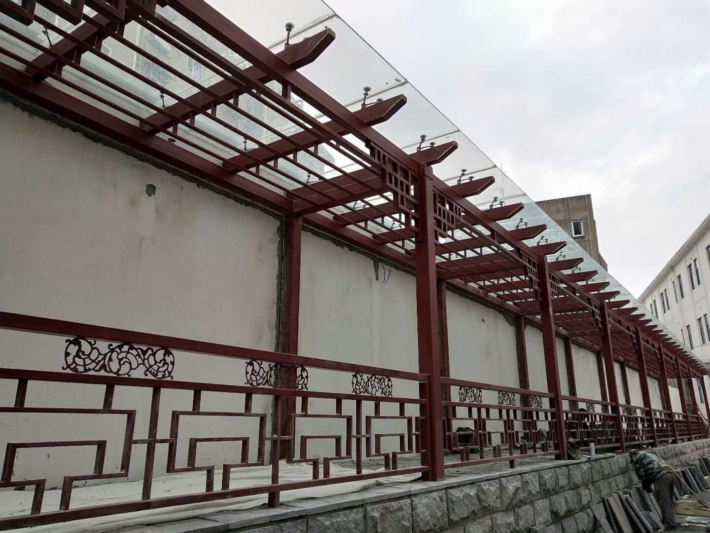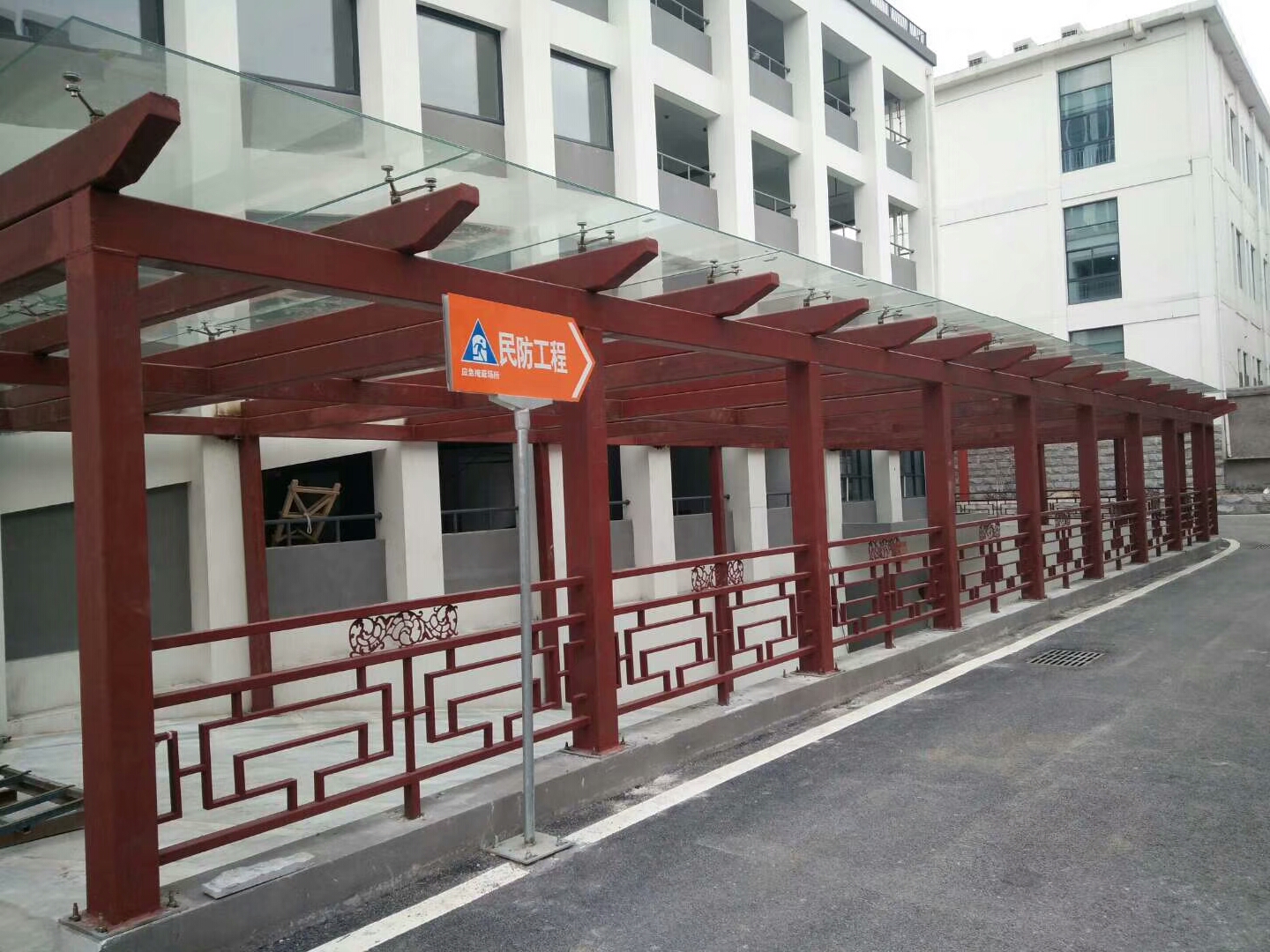 現階段施工總面積為 1205 平方米 ,其中建筑包含 長廊、九宮花格護欄、車庫廊架;仿木紋漆顏色由安徽省副省長李建中同志親自挑選,由莫藝師傅反復調色,現場多次試樣才得以最終確定。