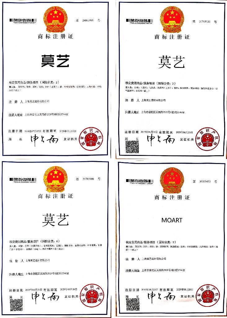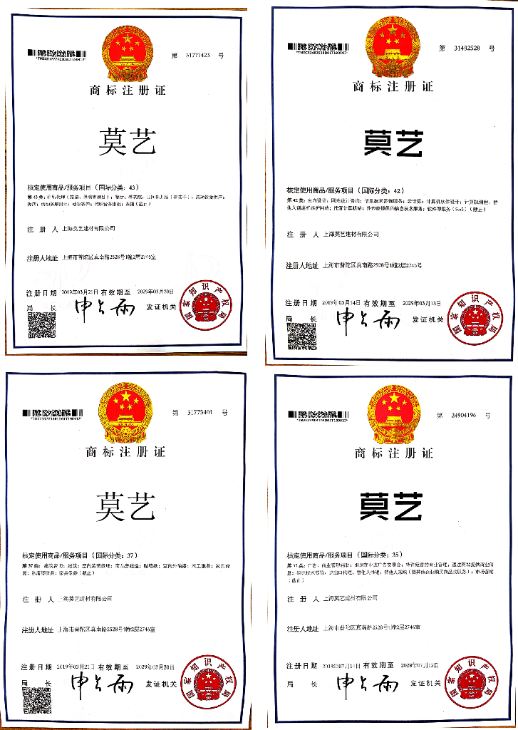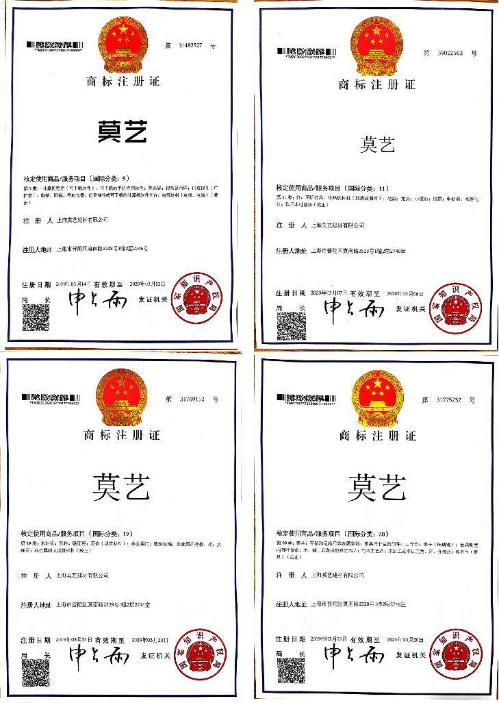 近年來(lái)莫藝集團(tuán)發(fā)展持續(xù)增長(zhǎng),經(jīng)營(yíng)業(yè)務(wù)日益擴(kuò)大,客戶(hù)口碑不斷提高。公司為了實(shí)現(xiàn)品牌戰(zhàn)略規(guī)劃及適應(yīng)市場(chǎng)日新月異的變化,進(jìn)一步提升品牌效應(yīng),在已有類(lèi)別的商標(biāo)注冊(cè)證基礎(chǔ)上,申請(qǐng)其他類(lèi)別的商標(biāo)注冊(cè)并成功通過(guò)申報(bào),至此莫藝集團(tuán)完成了“莫藝(或MOART)”商標(biāo)的全類(lèi)別注冊(cè),共45個(gè)大類(lèi)。