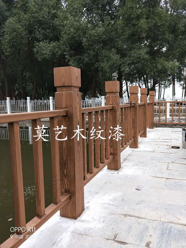 木紋漆屬于美術漆,是一種通過特殊手法可以在非木頭材質表面做出與‘原木’相似度99%的漆類。目前已經廣泛運用于公園、景區道路護欄,各式廊架葡萄架、高檔小區內外墻面、廣告標示牌等一系列建筑設施外表面。可適用的材質有:方鋼、不銹鋼、鍍鋅管、鋁合金、鐵管、水泥面(柱)、混凝土、密度板、PVC塑料材質等等。